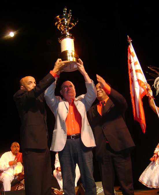 Vice-presidente de comunicação social do Inter, Gelson Pires (C), levanta o troféu do carnaval 2009 com a direção da Imperadores