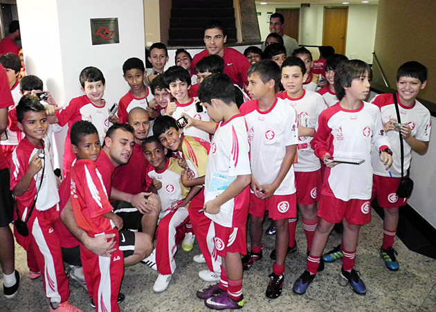 A delegação do Internacional recebeu neste sábado pela manhã uma visita especial na sua concentração em Barueri-SP. Um grupo de 25 crianças da escolinha do Projeto Genoma Colorado em Itapecerica da Serra, cidade situada a cerca de 33 quilômetros da capital São Paulo, teve a chance de conhecer os ídolos colorados de perto no hotel onde o time esteve hospedado até a partida contra o Palmeiras. Acompanhados pelo diretor Edu Nasravi e o professor Marciel, os garotos puderam tirar muitas fotos e pegar autógrafos. A escola do Inter na cidade paulista conta com quase 300 alunos.