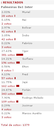 O volante Ygor foi eleito pelos internautas como o melhor jogador em campo na vitória de 1 a 0 sobre o Palmeiras, no último sábado, na Arena Barueri. Autor do gol da vitória na partida válida pela 14ª rodada do Brasileirão, o jogador recebeu 381 votos (27.63%). O atacante Diego Forlán, também de boa atuação, ficou em segundo com pouca diferença de votos: 343 (24.87%). Mais de 1 mil internautas participaram da enquete promovida pelo site.