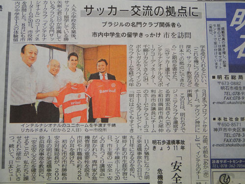 Se firmada a parceria, a escola de futebol do Inter será sediada em Akashi-Shi, uma cidade próxima a Osaka. Inclsuive, Hirosama já esteve reunido com o prefeito da cidade e o presentou com uma camisa do Inter, fato repercutido nos jornais da cidade (conforme reprodução abaixo).