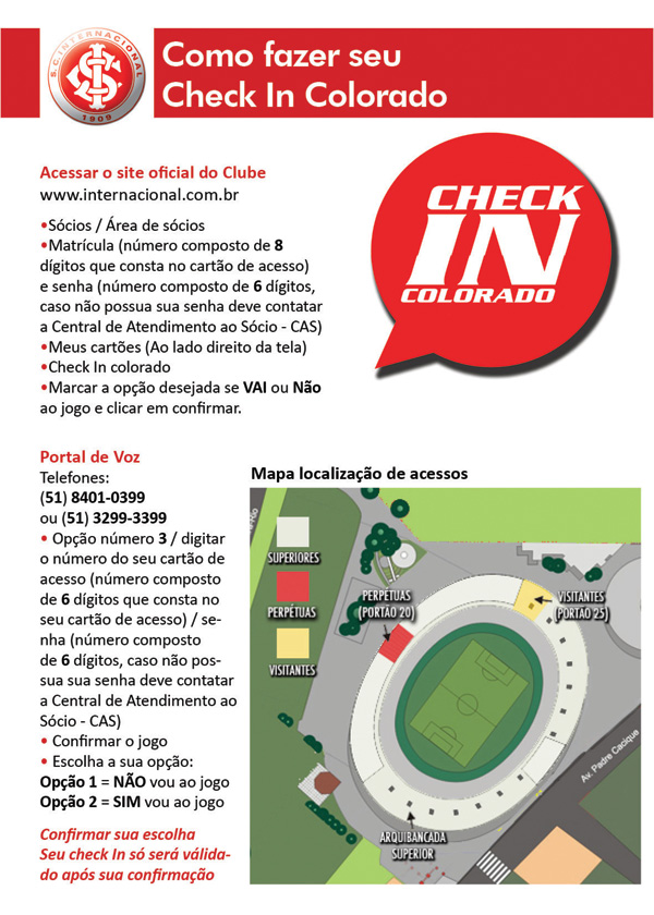 O Internacional prorrogou para as 15h deste domingo (12/8) o horário de encerramento do Check In Colorado para o jogo Inter x Ponte Preta, que começa às 16h deste domingo, pela 16ª rodada do Brasileirão. É OBRIGATÓRIO que os sócios que não precisam adquirir ingressos avisem pelo sistema Check In Colorado se virão ou não ao jogo.