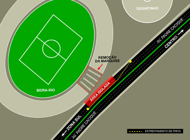 O Sport Club Internacional informa que nesta sexta feira (17/08), às 21h, a construtora Andrade Gutierrez vai dar início à Operação Cacique, como foi denominada a retirada da marquise (boné) da arquibancada superior que fica situada na avenida Padre Cacique. Em razão desta remoção, a Empresa Pública de Transporte e Circulação (EPTC) bloqueará o trânsito no sentido centro-bairro em duas pistas (conforme imagem abaixo) para que o guindaste possa realizar os trabalhos. A previsão de finalização da retirada e consequente liberação das pistas é às 21h de domingo.