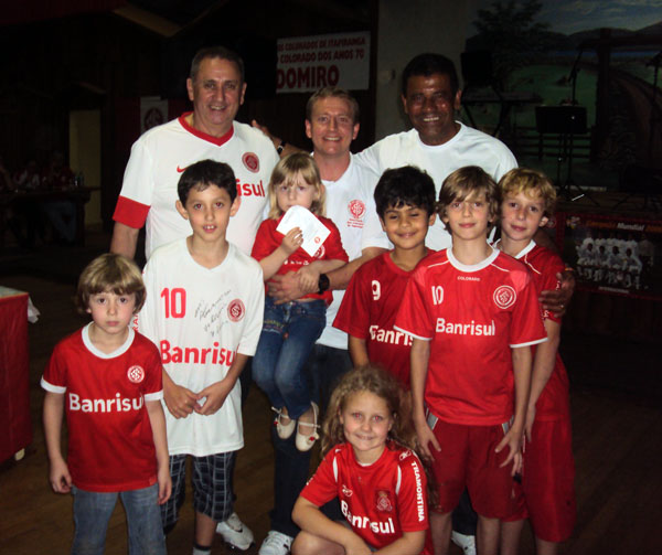 O diretor regional Roberto Denardin, o cônsul de Irapiranga, Lairton Körbes, e o ídolo Valdomiro presentes com a nova geração de colorados