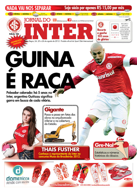 A primeira edição no novo formato será lançada nesta sexta-feira (24/08), com distribuição até o dia 26 de agosto, sendo este último dia no Beira-Rio, quando houver o clássico Gre-Nal, que encerra o primeiro turno do Brasileirão 2012. Nesta edição, o guerreiro Guiñazu é o destaque principal na capa. Além do jogador, tem matéria especial sobre a nova modalidade de associação, Nada Vai Nos Separar, imagens da evolução das obras no Estádio, a representante colorada no concurso Musa do Brasileirão 2012 e as estatísticas dos 392 Gre-Nais realizados até então. Na capa, um selo promocional no estilo 'recorte e ganhe' dá direito a um ingresso ao Museu do Inter, a ser retirado na Central de Atendimento ao Sócio (CAS), no Beira-Rio. Neste processo, o torcedor é cadastrado para um trabalho futuro de associação e outros mapeamentos. A segunda edição do novo Jornal do Inter está prevista para o final de semana do jogo Inter x Fluminense, para ser distribuído entre os dias 7 e 9 de setembro.