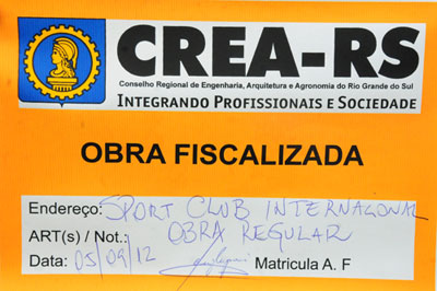 Após uma reunião na presidência do Internacional, o presidente do CREA e engenheiro civil, Luiz Alcides Capoani, e seus assessores, o engenheiro civil Donário Rodrigues Braga Neto e o engenheiro agrônomo Roberto Bento da Silva, juntamente com agentes fiscais e conselheiros representantes da Câmara Especializada de Engenharia Civil, visitaram as obras para verificar a presença de empresas e profissionais habilitados pelo órgão.