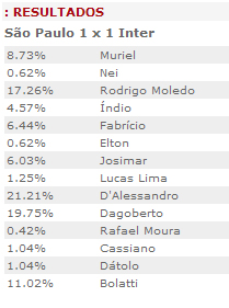 O meia D'Alessandro foi eleito o melhor jogador em campo na partida contra o São Paulo, na noite desta quarta-feira (05/09). O craque argentino foi eleito na enquete promovida pelo site do Inter com 21,21% dos votos. Veja o resultado completo abaixo: