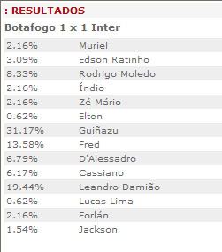 De volta ao time após defender a Argentina, em jogos válidos pelas Eliminatórias da Copa, o volante Guiñazu foi escolhido o melhor em campo no empate contra o Botafogo. Em enquete promovida aqui no site, a torcida o elegeu como o melhor jogador contra os cariocas, com 31.17% dos votos. Confira os números da votação: