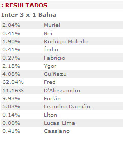 Mais uma vez o garoto Fred teve grande atuação entre os profissionais do Internacional. A jovem revelação das categorias de base do Clube inclusive marcou o primeiro gol da vitória por 3 a 1 contra o Bahia. Fred foi escolhido o melhor em campo em enquete promovida aqui no site, quando a torcida o elegeu com 62.04% dos votos. Confira os números da votação:
