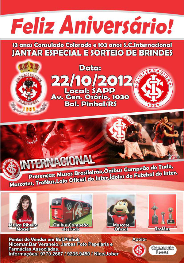 O jantar terá sorteio de brindes e as presenças de grandes ídolos do Inter, do ônibus Campeão de Tudo, de musas, dos mascotes, dos troféus e produtos oficiais à venda.