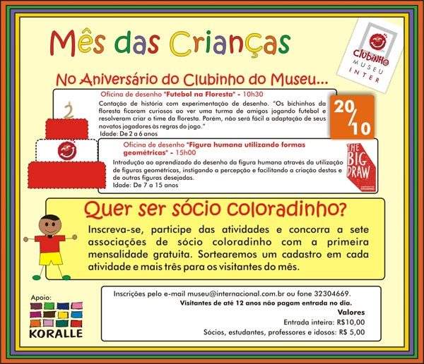 No próximo final de semana tem mais atividades do Clubinho do Museu! Sábado (20/10) será comemorado o aniversário de 2 anos do Clubinho do Museu com atividades especiais para os pequenos. Às 10h30, será realizada a oficina de desenho 'Futebol na Floresta' e, às 15h, a oficina de desenho 'Figura Humana Utilizando Formas Geométricas'. Traga a criançada e venha participar! Saiba mais:
