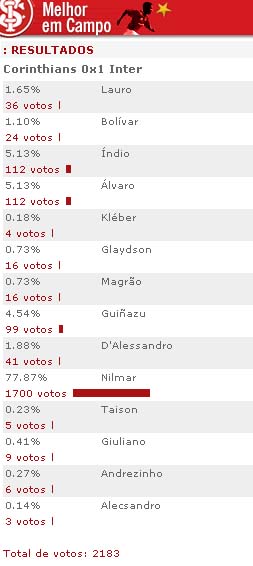 Autor do gol antológico sobre o Corinthians, Nilmar foi eleito de forma esmagadora pelos internautas como o melhor jogador em campo no Pacaembu. Veja os números da votação: