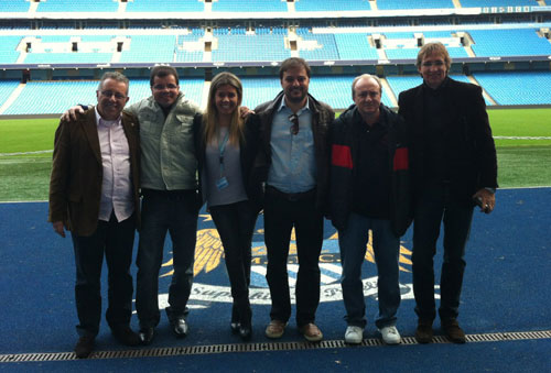 No estádio do Manchester City, Avancini (E), Wilson Manoel Filho, gerente de relacionamento com o sócio do Bahia, Tania Cunha, gerente de serviços ao cliente do time da casa, Sasha Mamede, diretor de marketing do Bahia, Adauri Silveira e Paulo Cesar Verardi, executivo de marketing do Grêmio