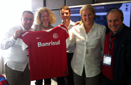 Jorge Avancini (E) e Adauri Silveira (D), com dirigentes do Tottenham: Fran Jones, diretora comercial, Aidan Mullally, gerente sênior de desenvolvimento de negócios internacionais, e Emma Taylor, diretora de marketing