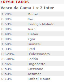 Responsável pelos passes precisos para os dois gols marcados por Forlán, o meia D'Alessandro foi eleito o melhor jogador em campo na vitória de 2 a 1 sobre o Vasco da Gama, em enquete promovida pelo site. O camisa 10 do Inter recebeu 60.24% dos votos. Confira os números da enquete: