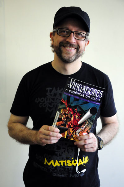 Thedy Corrêa com o exemplar "Os Vingadores"