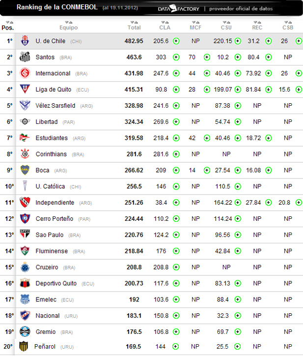 A Conmebol divulgou nesta segunda-feira (19/11), em seu site oficial, a atualização do ranking dos melhores clubes da América do Sul. O Internacional ocupa a terceira colocação, com 431.98 pontos, e é o segundo melhor brasileiro da lista. A Universidad de Chile, atual campeã da Copa Sul-Americana, e o Santos, campeão da Libertadores de 2011, estão na primeira e segunda posição, respectivamente.
