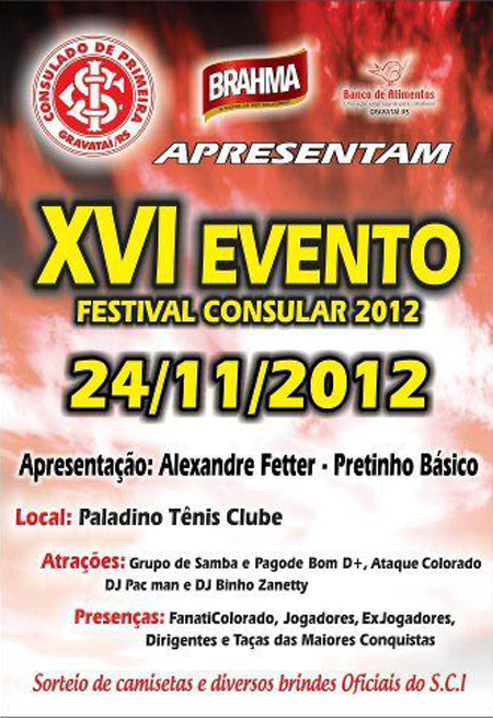 O próximo sábado (24/11) em Gravataí será marcado pelo XVI Evento Consular do Internacional. Os colorados que quiserem prestigiar a festa devem adquirir ingresso no valor de R$ 25,00 + 2kg de alimentos não-perecíveis (imprescindível), que darão direito a cinco espetinhos, um caneco personalizado e adesivo. O evento terá transmissão ao vivo da Rádio Guaiba AM 720 e FM 101.3.