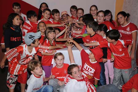 Criançada ao lado da Taça do Mundial Fifa, em Ronda Alta