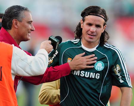 Marcão, ex-Inter, recebe os cumprimentos do técnico Tite