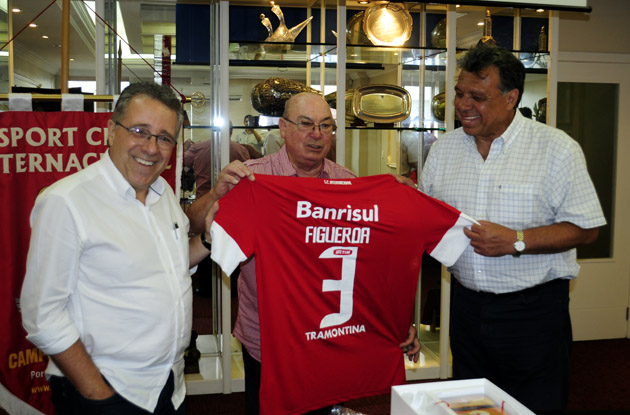 O ex-zagueiro e ídolo eterno do Internacional Elias Figueroa esteve no Beira-Rio na tarde desta segunda-feira (17/12) para receber uma homenagem do Clube. Após ser nomeado Embaixador da Copa do Mundo de 2014 da cidade de Porto Alegre, em cerimônia realizada na Prefeitura Municipal, o ex-jogador recebeu das mãos do vice-presidente de relações sociais, Gelson Pires, uma camisa oficial do Campeão de Tudo.