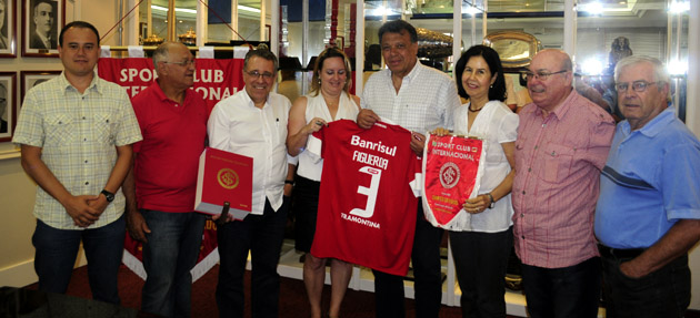 O diretor executivo de marketing do Inter Jorge Avancini presenteou o lendário zagueiro da década de 1970 com um kit de artigos oficiais, que tinha DVD, livro e alianças do Clube.
