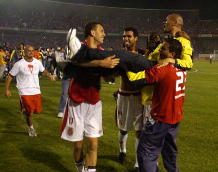 Jogadores erguem Guiñazu após a conquista da Sul-Americana, em 2008