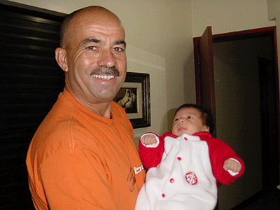 Recém-chegada ao mundo, Betina - filha de Larry Passos, o treinador do tenista Gustavo Kuerten - já veste as cores do Internacional. Na foto, Larry P exibe orgulhoso a nova colorada, já devidamente fardada com as cores do clube.