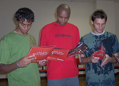 Cleiton Xavier (E), Vinícius (C) e Rafael Sobis (D) atentos na leitura da revista