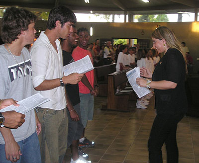 Da esq. para dir.: Marcelo Labarthe, Rogério Gaúcho, Diogo e Diego, com a responsável pela catequese e Primeira Comunhão, Andréa Rotunno