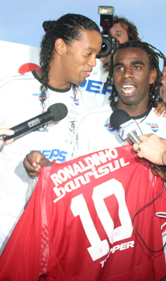 Ronaldinho Gaúcho, ao lado de Tinga, ganhou uma camisa do Inter