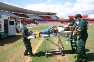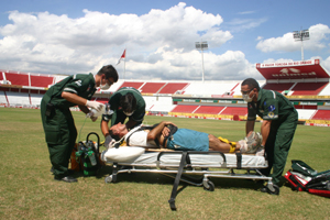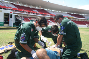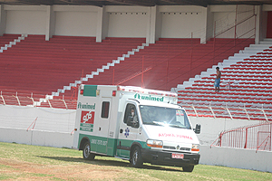 A Unimed realizou a simulação de um atendimento médico de emergência, na última sexta-feira, no gramado do Estádio Beira-Rio. O tempo utilizado para que um atleta fosse socorrido em caso de emergência durante uma partida de futebol foi cronometrado. Veja a simulação passo a passo: