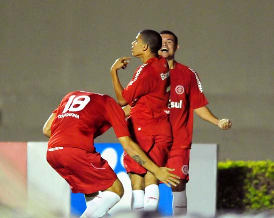 Inter 100%: Taison (C) comemora o gol que garantiu a terceira vitória consecutiva