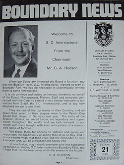 Mensagem de boas-vindas ao Sport Club Internacional, do presidente do Oldham Athletic G. A. Hudson, em 1975