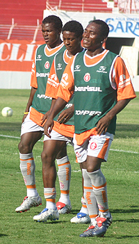 Os nigerianos Obinna, Anubi e Obediah (da esq. para a dir. na foto ao lado) - que passam por um período de aclimatação antes de serem contratados - também participaram do coletivo, e chamaram a atenção pela velocidade e movimentação em campo. Requisitados pela imprensa ao final do treinamento, os jogadores manifestaram suas impressões sobre o primeiro contato com bola no Beira-Rio: "Estou muito empolgado por jogar no Brasil e no Internacional. Foi um bom treino, mas precisamos de um maior tempo de adaptação", afirmou o meia Obediah. "É um grande privilégio poder jogar no Internacional. Acredito que vamos nos adaptar e jogar o nosso futebol", completou o centroavante Obinna.