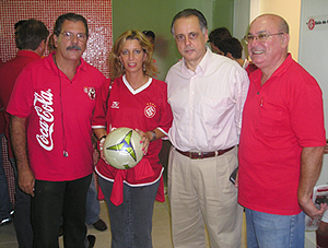 A sócia Hilda Maria Balbinot, de Florianópolis, recebeu a camiseta do volante Tinga, eleito o melhor jogador em campo pela Rádio Guaíba. A promoção do clube colorado visa valorizar os sócios que estão em dia. Na foto da esq. para dir.: Vice-Presidente de Marketing Otavio Rojas, a sócia Jozélia Lorenzi, o presidente Fernando Carvalho e o Vice-Presidente de Comunicação Social Gelson Tadeu Oliveira Pires.