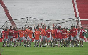 Apesar da forte chuva que caiu sobre Porto Alegre na tarde de quinta-feira, os jogadores colorados treinaram normalmente no gramado principal do Estádio Beira-Rio. O técnico Muricy Ramalho orientou exercícios de conclusão a gol, exigindo eficiência dos atacantes na hora da finalização. A novidade no treino foi o volante do time júnior Maycon, de 20 anos, que integra a delegação que viajou para Veranópolis.