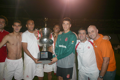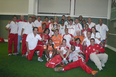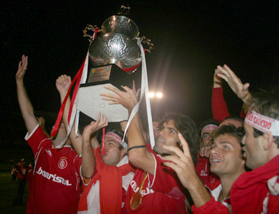 Jogadores, dirigentes e torcedores posavam para fotos com a taça, registrando da maneira mais espontânea possível o orgulho de ser colorado. Já no vestiário, os campeões assistiram ao compacto da decisão e comentavam cada lance com muita vibração. "Mas que cruzamento, hein!", dizia Fernandão, referindo-se ao lance do primeiro gol do Inter, quando Elder Granja cruzou na medida para Souza marcar. O técnico Muricy Ramalho observava o VT com a mesma tensão que lhe é peculiar quando está à beira do campo. "Calma, professor, o título já é nosso", brincou um funcionário do Clube, fazendo todo mundo cair na risada. Ainda não satisfeitos com as inúmeras fotos com a taça que foram tiradas no campo do Beira-Rio, os tetracampeões fizeram questão de fazer mais um registro, desta vez todos juntos. Foi a foto da união do grupo que conquistou de maneira heróica e inesquecível o 37º título estadual.