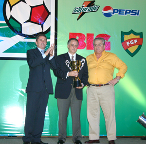 Presidente da FGF Francisco Novelletto (E), Fernando Carvalho (C) e Vice-presidente da Região Sul da CBF Emídio Perondi (D)