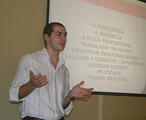 O zagueiro Sangaletti ministrou uma palestra, nesta segunda-feira, no auditório da FECI, para os funcionários do Sport Club Internacional denominada 'Em busca da Qualidade no Futebol - Sonho ou Realidade'. O evento faz parte do Programa Gaúcho de Qualidade e Produtividade (PGQP) .
