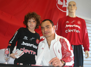 O Internacional lançou neste sábado, na loja InterSport do Beira-Rio, a camiseta personalizada do goleiro Clemer. O uniforme, nas cores branco, vermelho e preto, tem o nome estilizado e a assinatura do jogador. A camiseta é a segunda da série personalizada (a primeira foi do volante Tinga), e terá uma edição limitada de 100 peças em diversos tamanhos (inclusive infantil) que serão comercializadas com exclusividade na loja do Beira-Rio. Veja as fotos da camiseta personalizada: