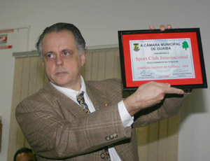 Fernando Carvalho segura a placa com homenagem ao Inter