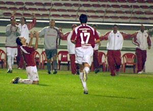 Gustavo (no detalhe, à esq.) está marcando o gol da vitória