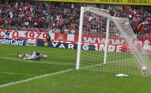 Cabeçada de Sobis vence o goleiro Édson Bastos...
