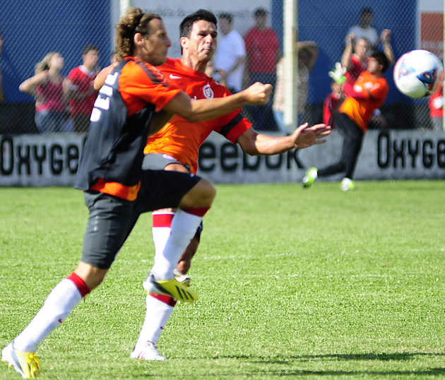 Em dividida com Forlán, Índio (D) mostra no treino a mesma dedicação dos jogos