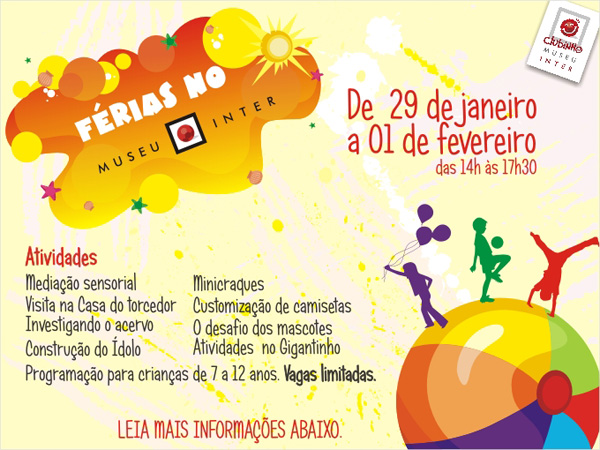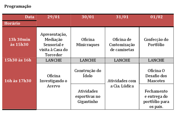 Serão desenvolvidas,ao longo de uma semana, diversas atividades sobre futebol, história, museu e artes de uma maneira lúdica e divertida. A programação conta com as oficinas “A história do Inter nas suas mãos” (mediação sensorial), “Investigando o acervo”,“Minicraques”, “Construção do Ídolo”, “Customização de camisetas”, “O desafio dos Mascotes”, visita à Casa do Torcedor com o historiador do Museu e atividades esportivas no Gigantinho. Além disso, a Cia. Lúdica marcará presença com suas oficinas e músicas e cada participante receberá um caderno de atividades para registrar os momentos mais marcantes dessa experiência.