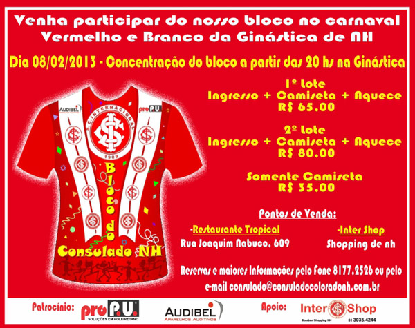 O consulado de Novo Hamburgo convida todos os Colorados a participarem no Bloco do Consulado no Baile do Vermelho e Branco da Sociedade Ginástica, no dia 08/02.