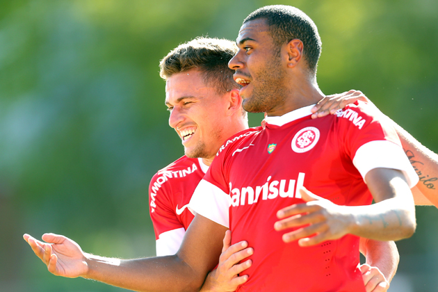 Cassiano (D) comemora o primeiro gol do Inter no Gauchão 2013
