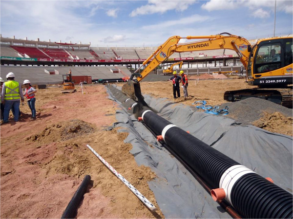 Rede de drenagem a vácuo do novo gramado começa a ser instalada