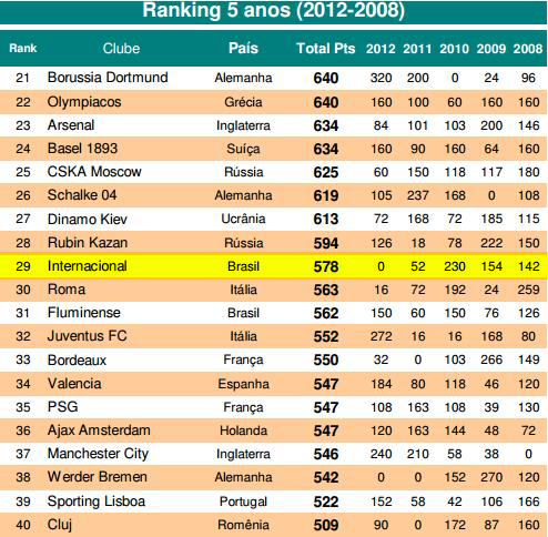A Pluri Consultoria, empresa brasileira especializada em negócios do esporte, divulgou na tarde desta quinta-feira (31/01) o ranking dos melhores clubes do mundo em 2012 e nas últimas cinco temporadas. O Inter é o segundo brasileiro melhor colocado. A lista abrange 1.199 clubes de 95 países diferentes, que disputaram as 130 principais competições de futebol nos últimos 5 anos, incluindo Campeonatos Nacionais de 1ª e 2ª divisões, Copas e Recopas Nacionais, Copas Continentais e o Mundial de Clubes. O Inter ainda é o 29º colocado no ranking geral dos últimos 5 anos. Confira alguns dos critérios usados pela Pluri para definir os rankings: