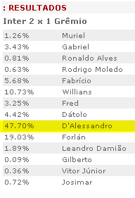 O meia D'Alessandro foi eleito o melhor jogador em campo no Gre-Nal 395 realizado domingo (03/02), no Colosso da Lagoa. O argentino recebeu 47,70% dos votos na enquete promovida pelo site do Inter. Veja o resultado completo: